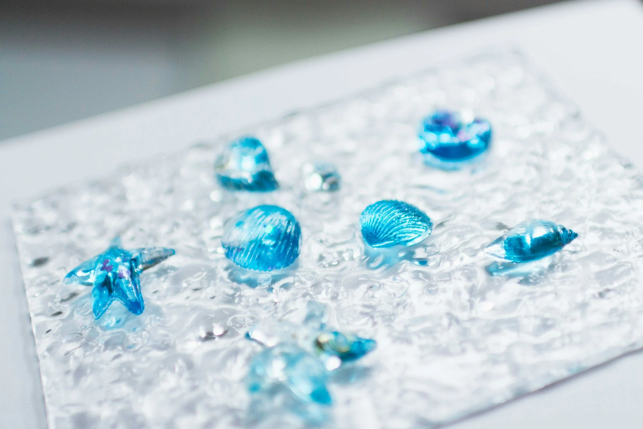 Each piece is handcrafted with intention using crushed glass, resin, and natural textures like shells. No mass production, just thoughtful creation.